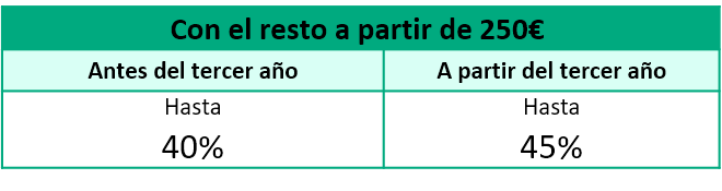 - A partir de los 250€, la deducción será de 40% del IRPF el primer año. En caso de hacer donaciones periódicas, a partir del tercer año el IRPF deducible subirá al 45%, solo en el caso de que las cantidades sean iguales o superiores a los dos ejercicios anteriores.
